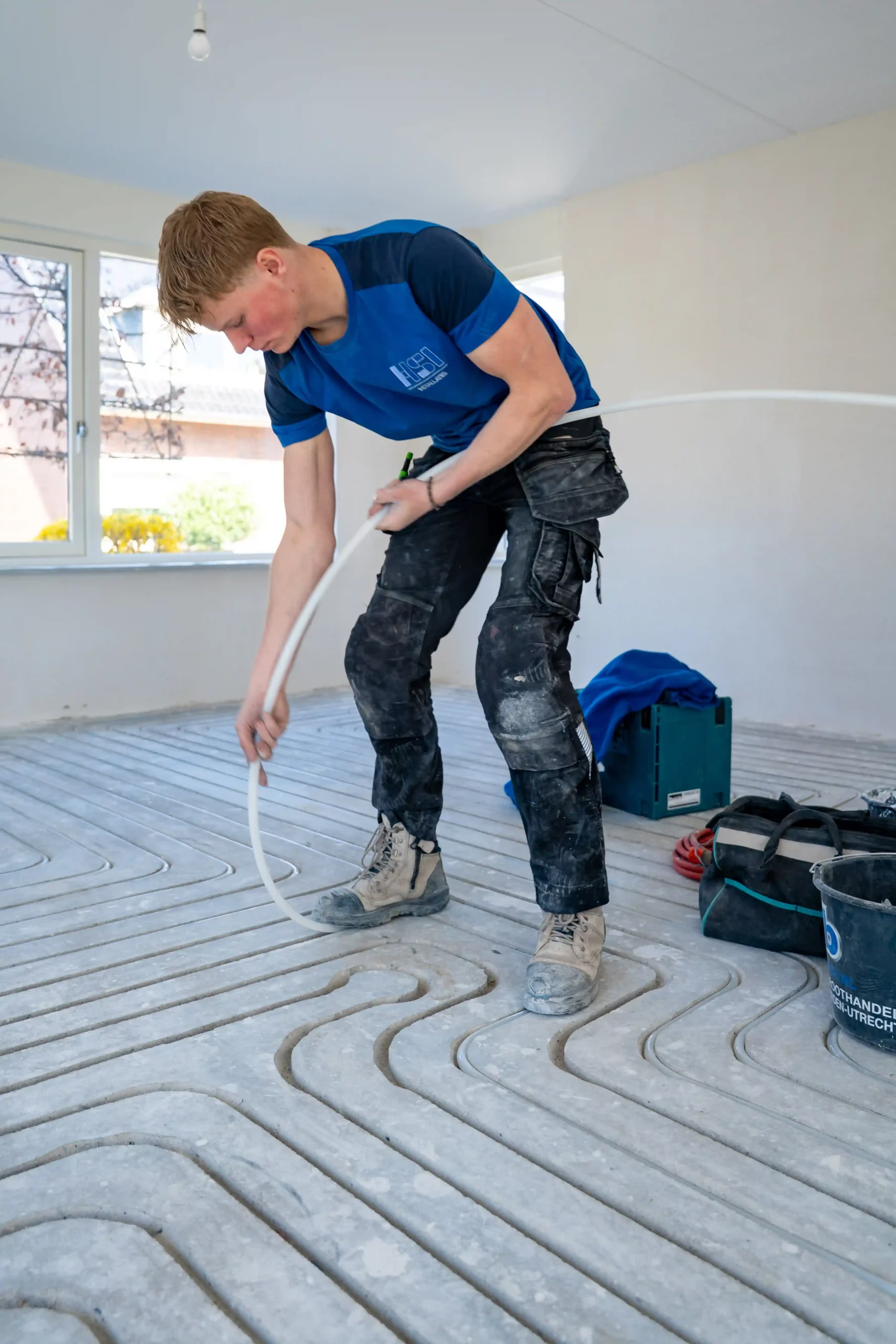 De vloerverwarmingsbuizen worden geplaatst onder de leefvloer tussen het dekvloer in gefreesde sleuven.