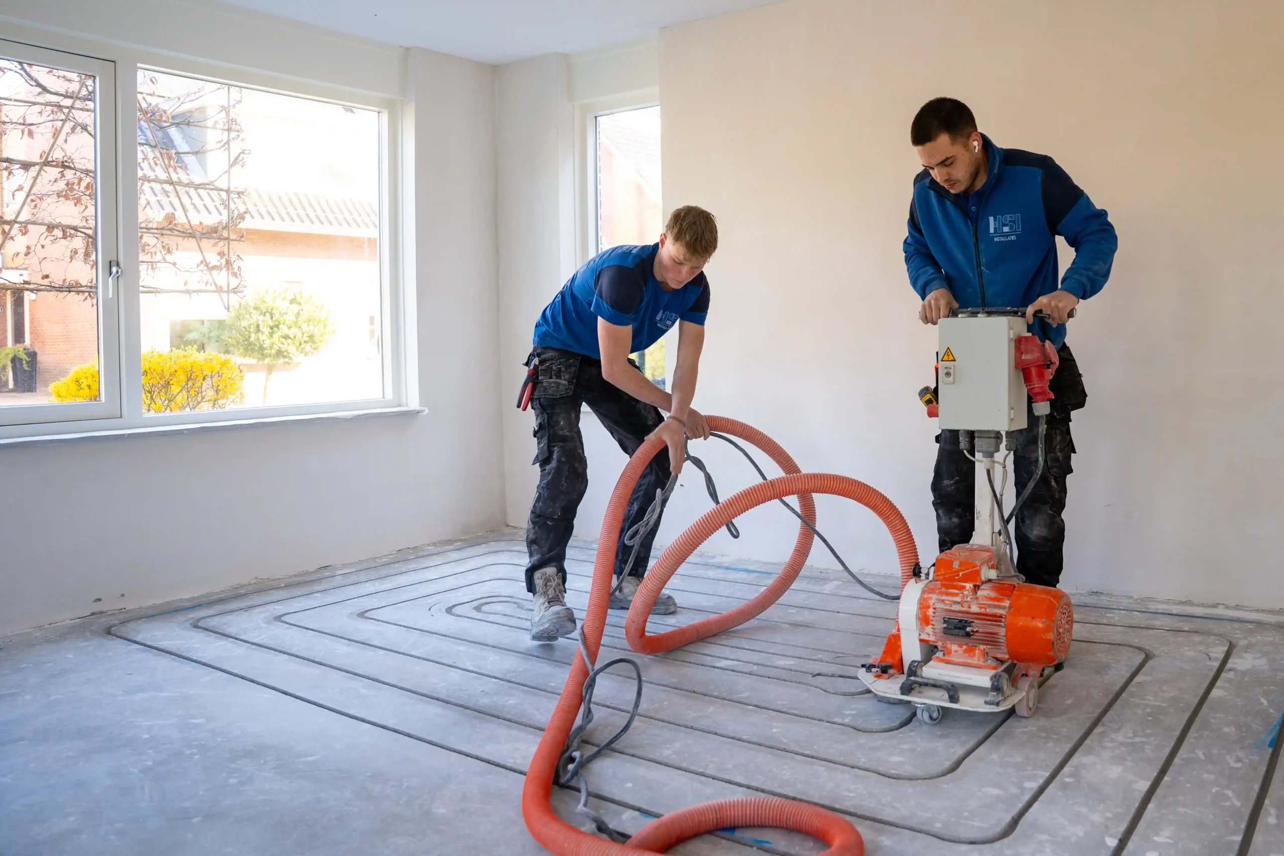 Bij het infrezen van vloerverwarming gebruiken wij een speciale freesmachine. Dit is om sleuven in bestaande vloeren te maken waarin de verwarmingsbuizen gaan liggen.